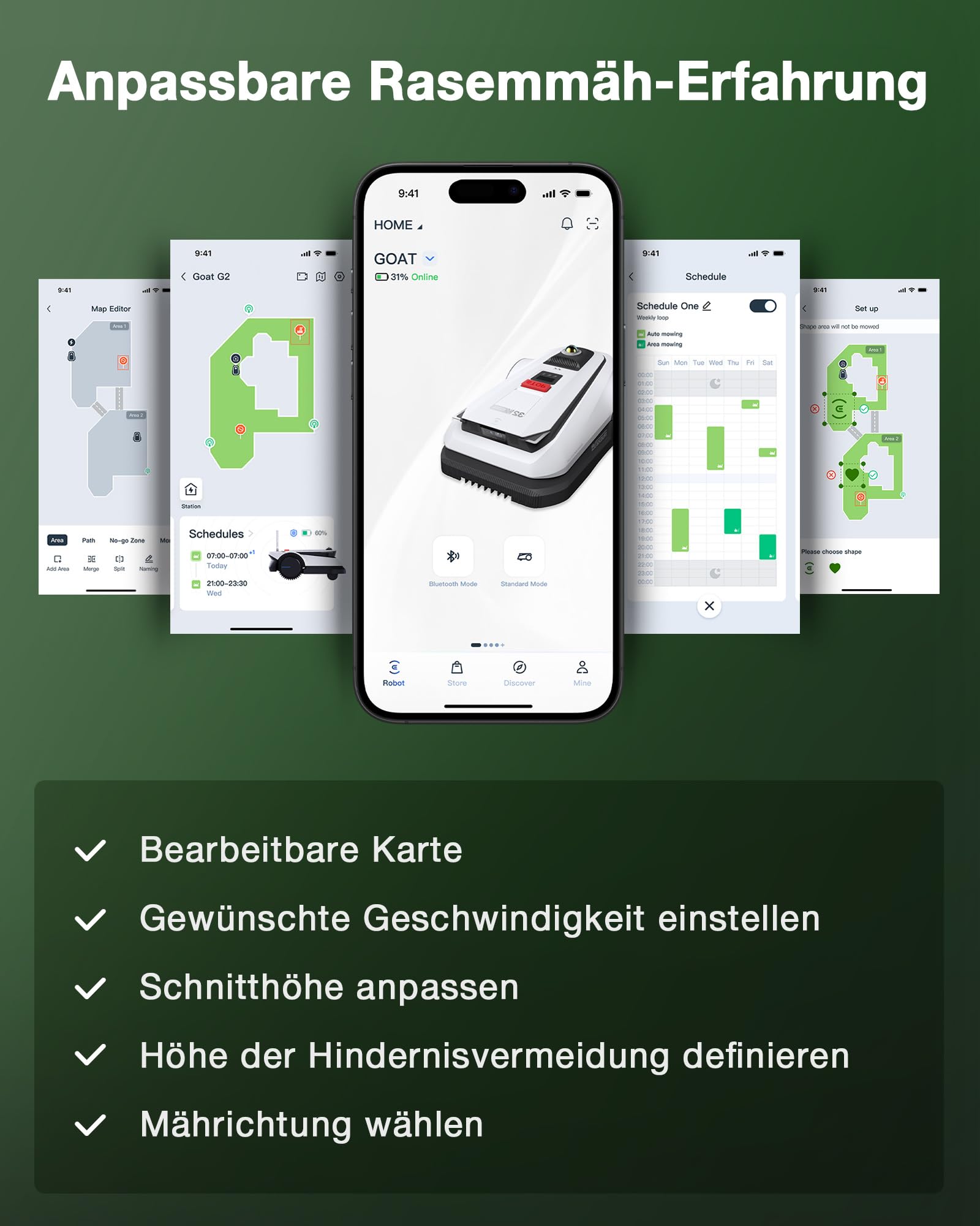 - Vollautomatische Kartierung: Der innovative GOAT Rasenmäher kartiert den Garten, in dem er alle Arten von Begrenzungen erkennt und automatisch definiert, ohne physische Markierungen zu benötigen. Kartierte Bereiche können mithilfe der Fernsteuerung in der App leicht anpasst werden, wodurch eine volle Kontrolle über den Mähbereich gewährleistet wird. Diese nahtlose Integration ermöglicht eine schnelle und einfache Einrichtung und garantiert eine präzise und personalisierte Gartenkarte für optimale Mähergebnisse.