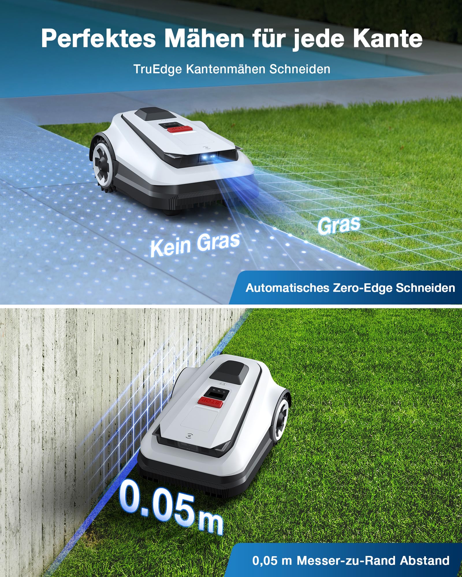 - 5 cm Klingenabstand zur Kante & Ride-On Mähen: Der GOAT vereinfacht das Kantenschneiden mit der präzisen TrueEdge Technologie, indem er an erkannte Hindernisse bis zu 5 cm nah heranfahren kann und somit randnahes Mähen ohne manuellen Eingriff ermöglicht. Mit 3D-ToF-LiDAR und einer KI-Kamera unterscheidet er mühelos zwischen Gras und überfahrbaren Nichtgrasbereichen, selbst bei Höhenunterschieden. Diese fortschrittliche AI Deep Learning Technologie erlaubt es dem GOAT präzise entlang von Wänden, Zäunen und Hecken zu mähen.